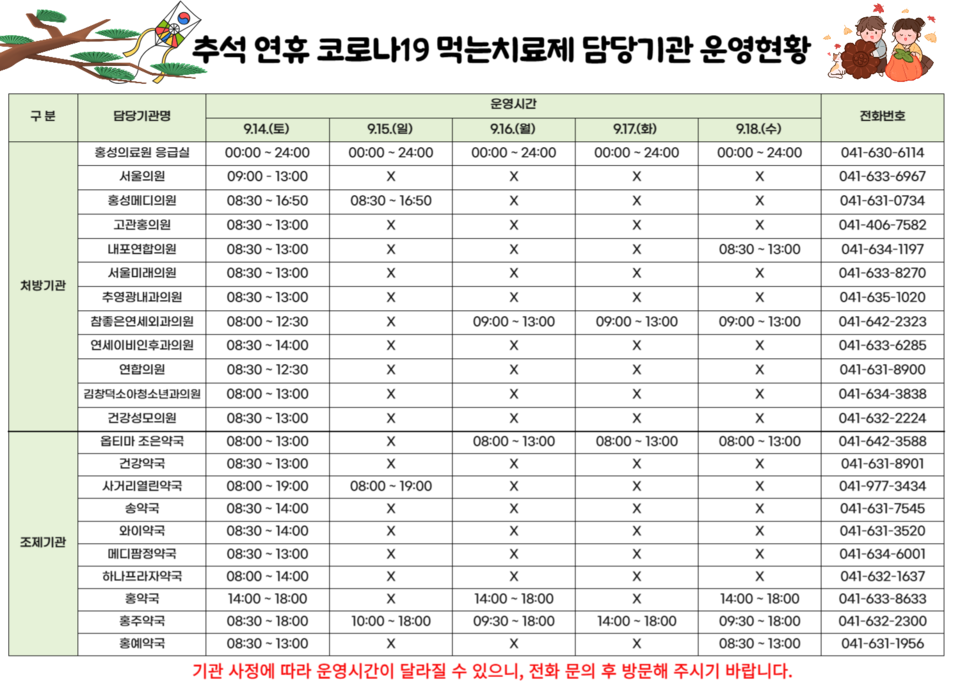 연휴 기간 중 운영되는 코로나19 먹는 치료제 담당기관 정보는 홍성군보건소 홈페이지를 비롯해 △응급의료포털 △보건복지부 누리집 △스마트폰 어플인 응급의료정보제공(e-gen) △유선전화 129(보건복지상담센터), 119(구급상황관리센터), 120(시․도 콜센터) 등 다양한 채널을 통해 확인할 수 있다.