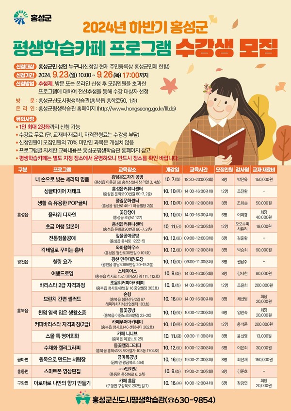 수강 신청은 9월 23일 오전 10시부터 26일 오후 5시까지 가능하며 신도시평생학습관 방문 또는 홍성군평생학습관 홈페이지를 통해 온라인으로 접수할 수 있다.