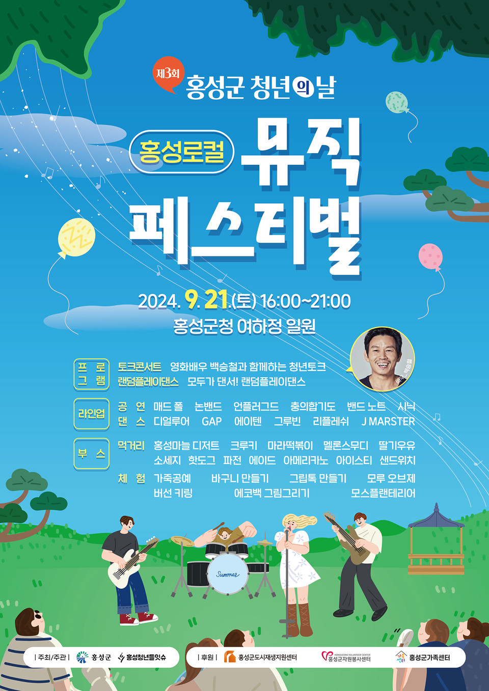 홍성군이 오는 21일 청년의 날을 맞아 오후 4시부터 9시까지 홍성군청 여하정 일원에서 ‘제3회 홍성군 청년의 날 행사’로 청년들이 주축이 돼 만드는 ‘로컬 뮤직 페스티벌’을 개최한다.