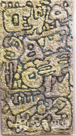 예시작품 <구성-목화솜 문자추상>은 1970년대 이응노의 문자추상 양식이 점점 완성돼 가고 있음을 보여주는 작품이다. 종이 위에 목화솜을 단단하게 뭉쳐서 붙이거나 엷게 펴서 바르기도 하고, 솜에 채색을 해 색의 변화를 추구하기도 하고, 한지에 먹을 먹여서 구긴 후에 문자의 윤곽을 따라서 붙이는 등 방식으로 제작했다.