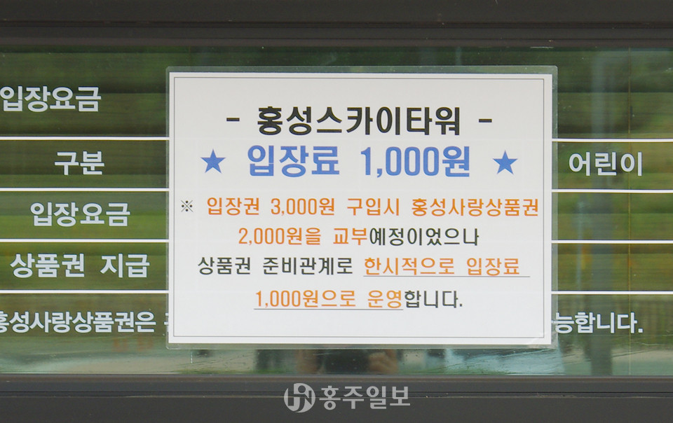 개장한 지 5개월이 넘어서고 있는 가운데 홍성스카이타워 매표소에는 ‘입장권 3000원 구입 시 홍성사랑상품권 2000원을 교부 예정이었으나 상품권 준비 관계로 한시적으로 입장료 1000원으로 운영합니다’라고 적힌 안내문이 붙여져 있었다.