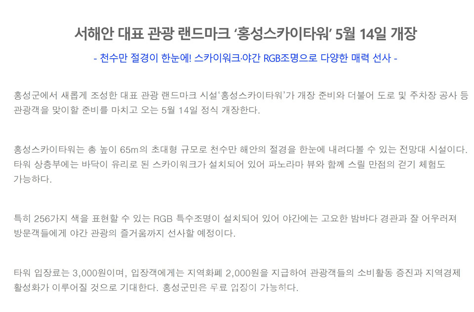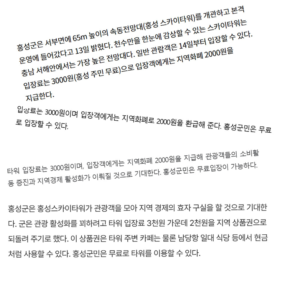 <홍주신문> 취재결과, 지난 5월 개장 이후 현재까지 홍성스카이타워 입장객에게 홍성사랑상품권이 지급된 적은 없는 것으로 밝혀졌다.