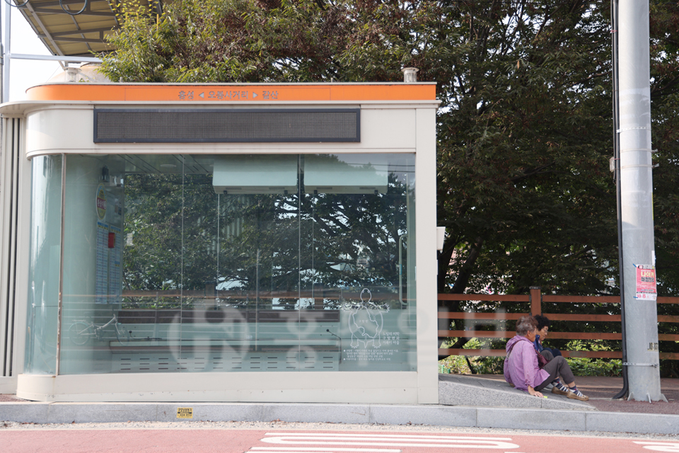 여름 못지않게 무더웠던 지난 11일 오후, 구항면 환승정류장(버스승강장) 옆에 두 어르신이 바닥에 주저앉아 버스를 기다리고 있었다. 어르신들 뒤편에는 홍성군이 설치한 스마트 버스승강장이 있었으나, 출입구 자동문이 열리지 않아 이용할 수 없었던 것이다.