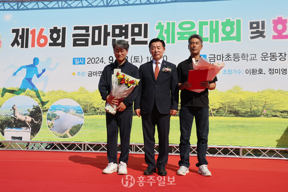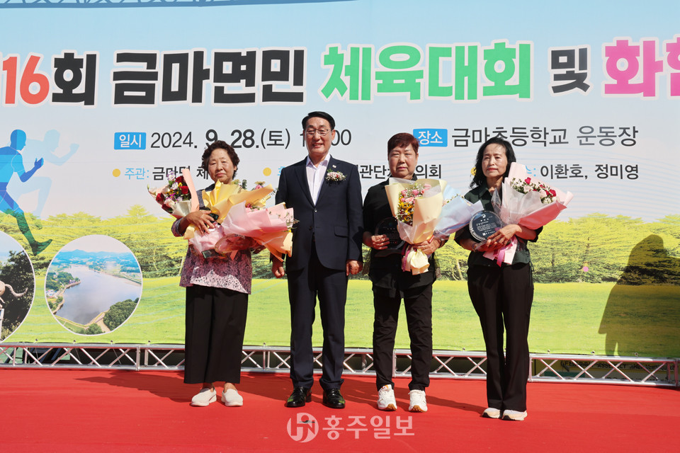 또한 이날 행사에 앞서 금마면 발전과 주민 화합에 앞장선 마을주민들에 대한 △홍성군수(용흥리 박정금·죽림리 박미숙·화양리 한성자) △홍성군 의회 의장(용흥리 이자원) △국회의원(월암리 박승곤·부평리 양해준) △홍성군 체육회장(장성리 김종학) △금마면장(송암리 이효재·화양리 구진숙) △금마면 체육회장(이산리 민광기)의 표창이 수여돼 주민들의 큰 박수와 축하를 받았다.