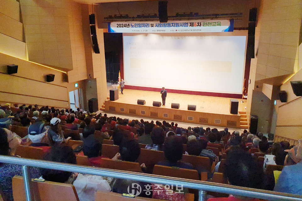 대한노인회 홍성군지회(지회장 조화원)는 지난달 27일 광천문예회관에서 5개읍·면 지역의 노인일자리 참여자 447명에 대해 안전사고에 대한 경각심을 일깨우고 안전보건 수칙을 전달해 안전하고 건강한 활동을 돕는 안전교육을 실시했다.
