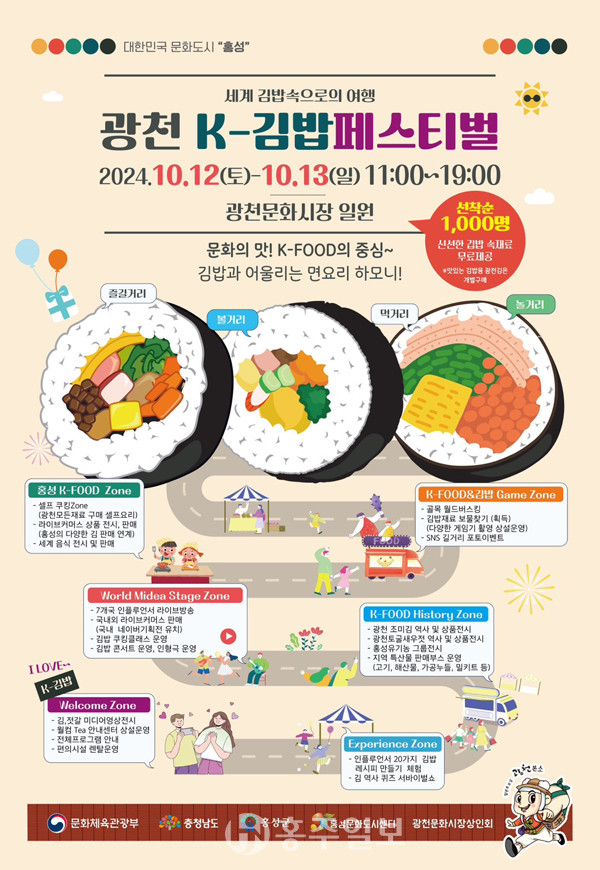 글로벌 K-푸드 혁명을 이끄는 조미김의 대표 생산지 광천읍에서 오는 12일부터 13일까지 이틀간 ‘광천K-김밥 페스티벌’을 개최한다.