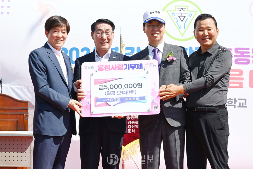 갈산중학교총동문회(회장 김재원)는 지난달 28일 모교운동장에서 열린 ‘총동문회·개교 73주년 기념 한마음대축제’에서 김재원 총동문회장과 유승철 대회장을 비롯한 동문들이 고향사랑기부제에 동참하며 600만 원을 기탁했다.