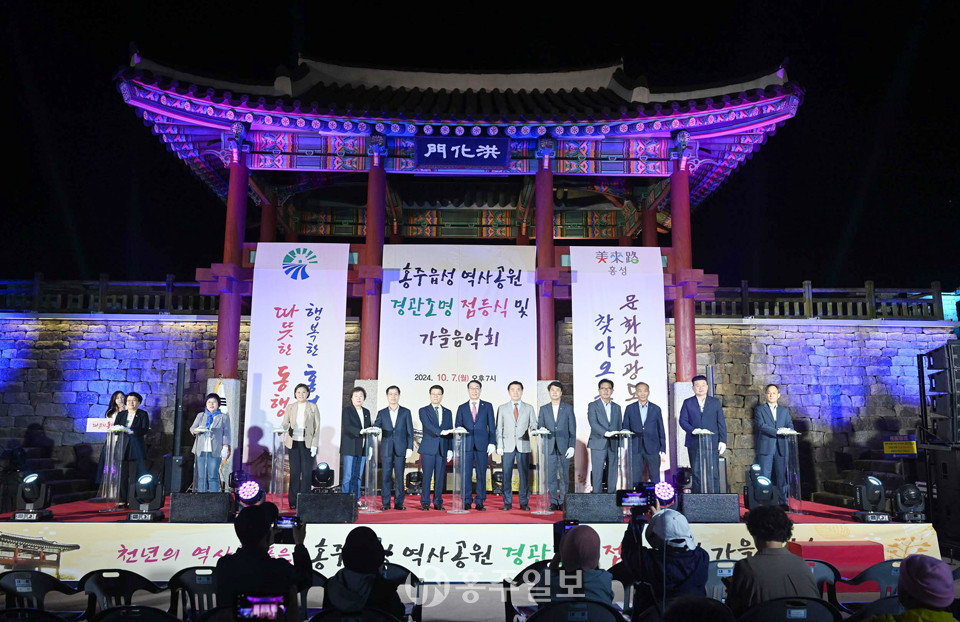 홍주읍성의 새로운 야간 명소 탄생을 축하하기 위한 ‘홍주읍성 역사공원 경관조명 점등식 및 가을음악회’가 지난 7일 홍주읍성 남문(홍화문) 광장에서 개최됐다. 이날 행사의 하이라이트인 경관조명 점등식에서는 참석자들의 환호 속에 홍주읍성이 화려한 빛으로 물들었다. 점등과 함께 진행된 기념촬영에서는 야간 조명으로 더욱 웅장해진 홍주읍성의 모습이 카메라에 담겼다.