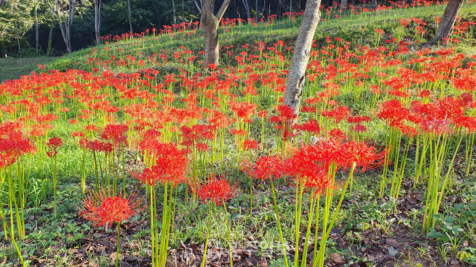 홍성군 결성면의 석당산이 붉게 물들었다. 마을주민들이 자발적인 식재로 시작된 석당산의 꽃무릇이 지속적인 관리를 통해 올해도 어김없이 화려한 꽃망울을 터뜨리며 가을의 정취를 선사하고 있다.
