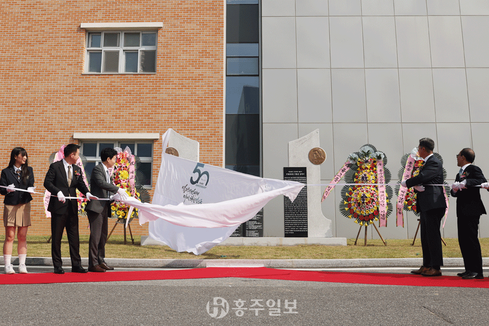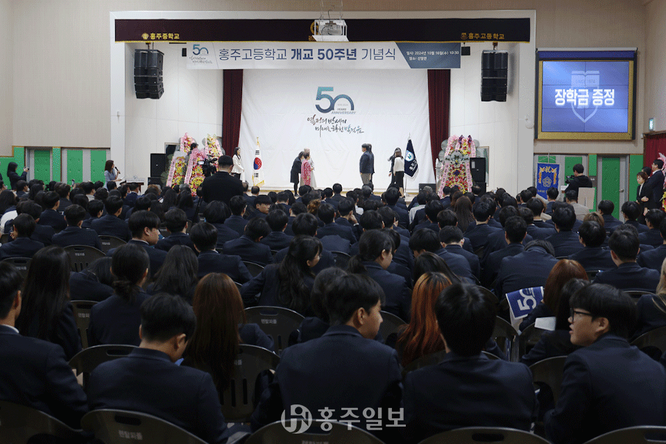 행사는 △개교50주년 기념영상 감상 △재학생 축하공연 △내빈 소개 △연혁 보고 △유영석 교장의 환영사 △이종원 이사장의 기념사 △내빈 축사 △공로패·감사패 수여 △장학금 전달 △50년사 영상 상영 △홍주비전 5.0 소개 △50주년 표어 세리머니 △교가 제창 △공적비 제막식 △학교로고 제막식 순으로 진행됐다.