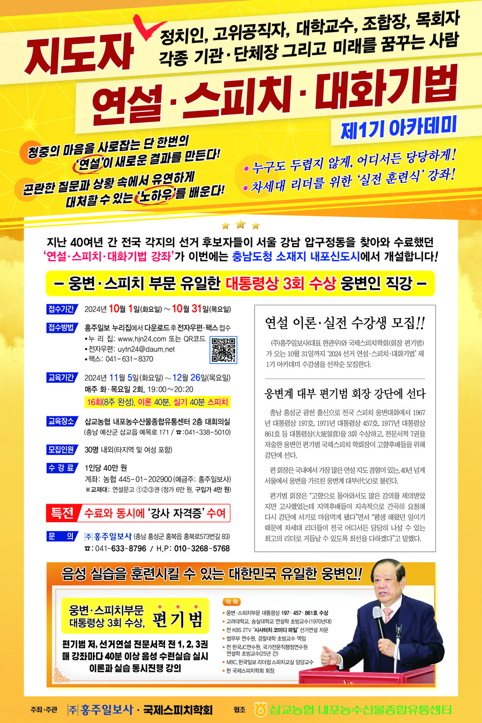 ㈜홍주일보사(대표이사 한관우)와 국제스피치학회(회장 편기범)가 함께 『지도자 연설·스피치·대화기법 제1기 아카데미』 수강생을 아래와 같이 모집합니다. 아래 내용을 참고하시어, 홍주일보 누리집(www.hjn24.com)에서 입학원서를 다운로드 받아 2024년 10월 31일(목요일)까지 전자우편(uytn24@daum.net) 또는 팩스(041-631-8370)로 접수바랍니다.