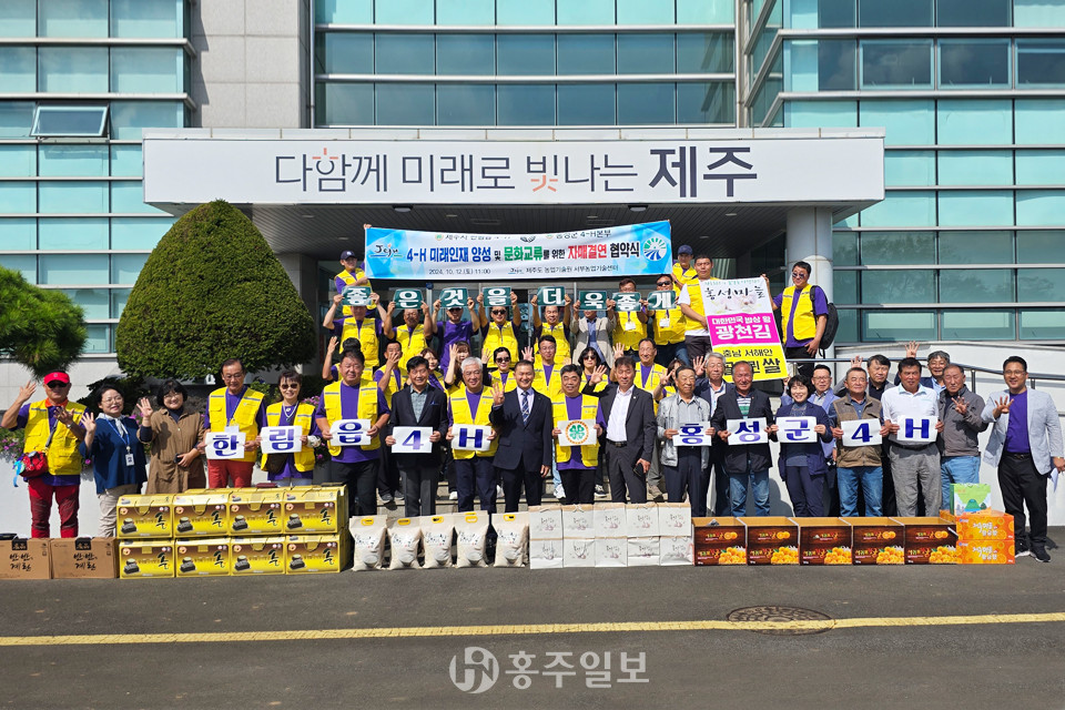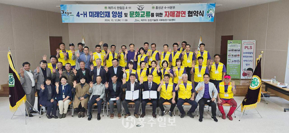 홍성군4-H본부(회장 이흥실)가 지난 12일 제주시 한림읍4-H본부(회장 김용천)와 제주특별자치도 농업기술원 농업인 교육관에서 자매결연 협약을 체결했다.<사진>