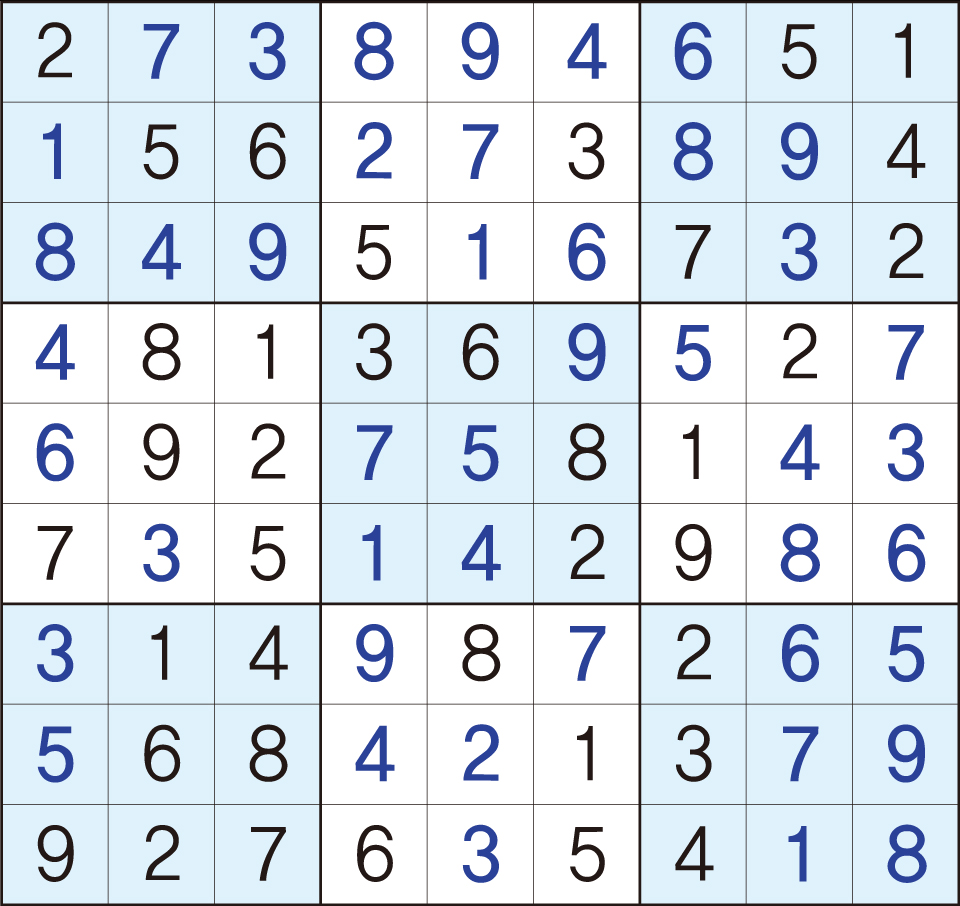 3. 큰 정사각형(9x9) 안에 있는 작은 정사각형(3x3) 안에는 숫자 1~9가 각 한 번씩 들어간다.