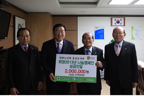 대한노인회홍성군지회(지회장 이범화)는 지난달 28일 불우이웃돕기 성금 200만원을 홍성군에 전달했다. 이번에 전달한 성금은 관내 359개 경로당 회원들이 돼지저금통에 저금한 돈을 모은 것으로, 불우이웃을 돕자는데 전 회원들이 단결된 모습으로 앞장 서 실천했다. 저작권자 © 홍주일보 무단전재 및 재배포 금지 최선경 기자 다른기사 보기 페이스북 카카오톡 URL복사 기사공유하기