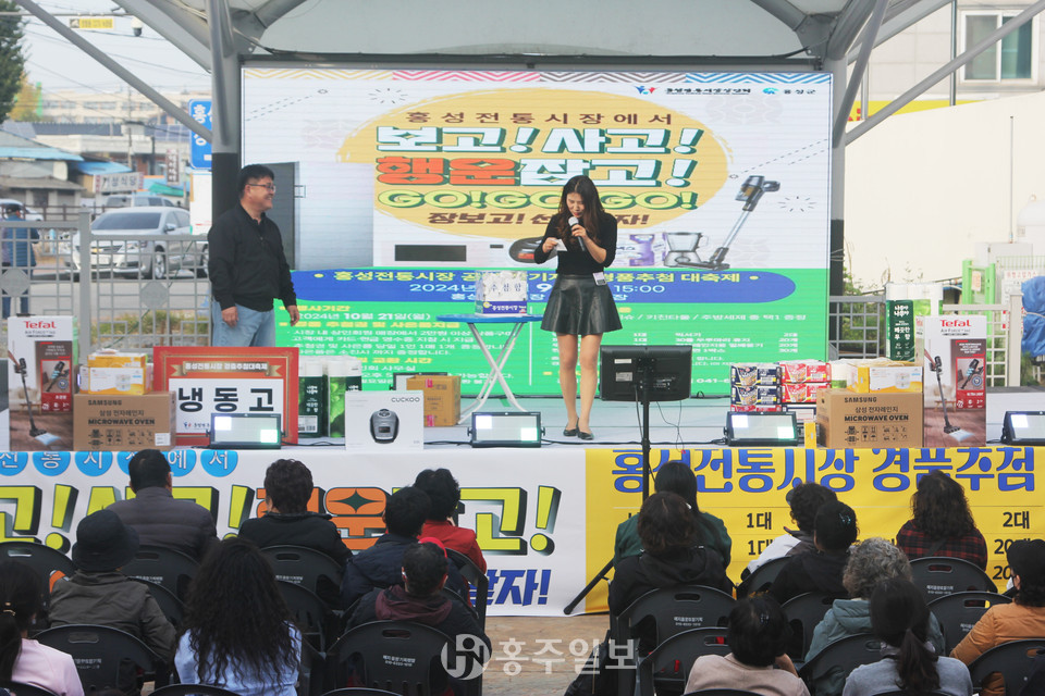 지난 9일 오후 3시 홍성전통시장 야외공연장에서 공연, 장기 자랑, 경품 추첨 대축제가 열렸다.<사진>