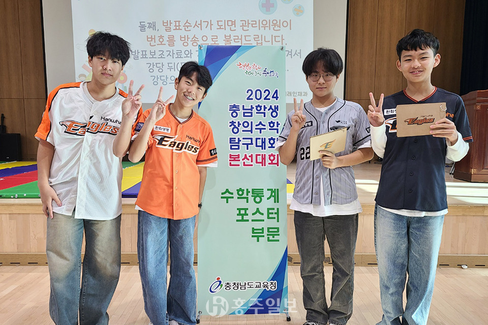 홍주중학교(교장 윤한석) 3학년 안병현, 최찬호, 김찬우, 김예준 학생이 ‘2024년 충남 학생 창의수학 탐구대회’ 수학통계 포스터 부문 본선에서 ‘응답하라 1999’를 주제로 최우수상을 수상해 수학적 재능과 창의성을 입증했다.