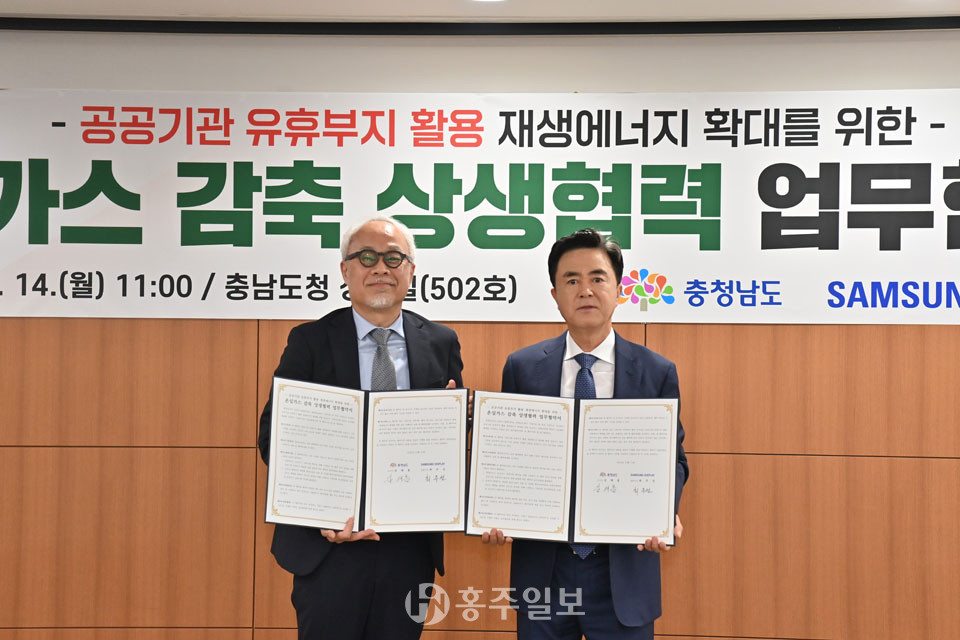 도는 14일 도청 상황실에서 김태흠 지사와 최주선 삼성디스플레이 대표이사가 참석한 가운데, ‘공공기관 유휴부지 활용 재생에너지 확대를 위한 온실가스 감축 상생협력 업무협약’을 체결했다.