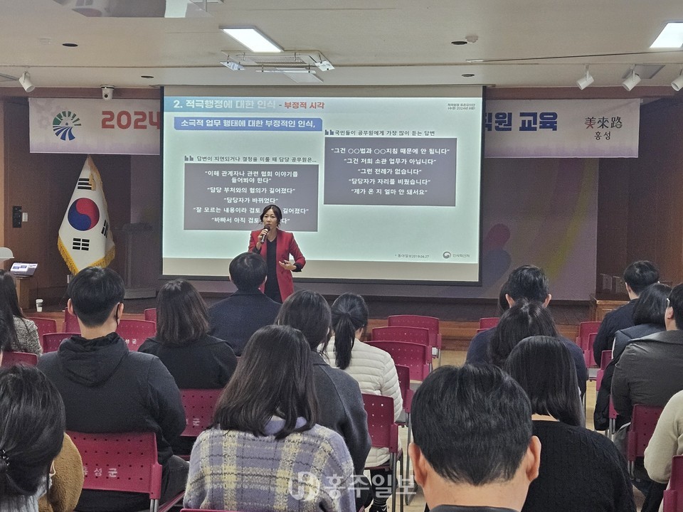 홍성군은 공직사회의 적극 행정과 혁신 문화확산을 위해 지난 19일 군청 대강당에서 ‘2024년 적극 행정 및 혁신 역량 강화 교육’을 실시했다.