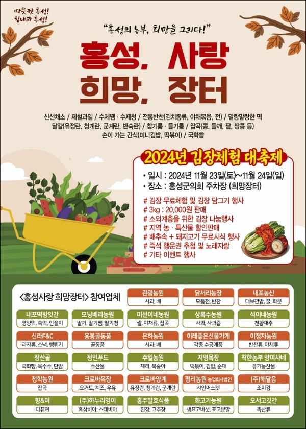 홍성군6차산업협동조합(대표 이환진)이 오는 23일과 24일 이틀간 홍주읍성 일원에서 김장철을 맞이 ‘홍성사랑 희망장터’를 운영한다.