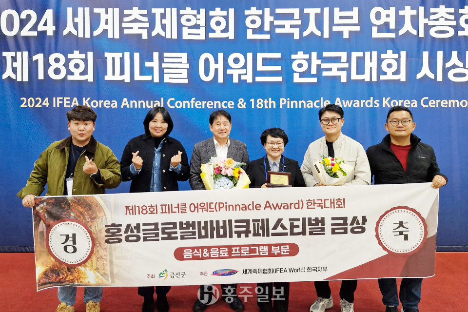 피나클 어워드는 세계축제협회(IFEA WORLD) 한국지부가 주관하는 전 세계 2000여 개 축제의 창의성과 우수성을 발굴하는 권위 있는 시상식으로, 이번 대회에서 홍성글로벌바비큐페스티벌은 ‘음식&음료 부문’ 금상과 ‘글로벌교류부문’ 동상을 수상하며 국제 축제 무대에서 그 우수성을 인정받았다.