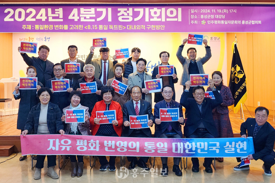 민주평화통일자문회의 홍성군협의회(협의회장 박만, 이하 홍성군협의회)는 지난 19일 홍성군청 대강당에서 자문위원 29명이 참석한 가운데 ‘2024년 4분기 정기회의를 개최했다. 이번 정기회의는 ‘통일환경 변화를 고려한 <8.15 통일 독트린> 대내외적 구현 방안’을 주제로 열렸다.