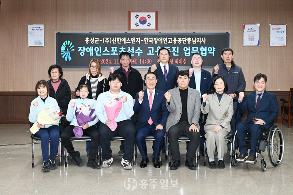 홍성군은 장애인스포츠 선수들의 안정적인 경제활동 기반 구축을 위해 지난 25일 ㈜신한에스엔지, 한국장애인고용공단과 ‘장애인스포츠선수 고용증진을 위한 업무협약’을 체결했다.<사진>