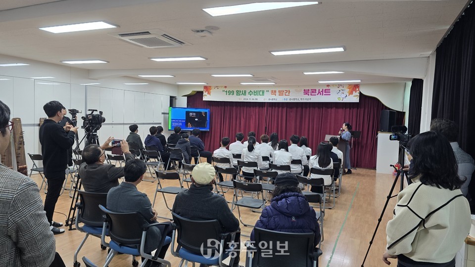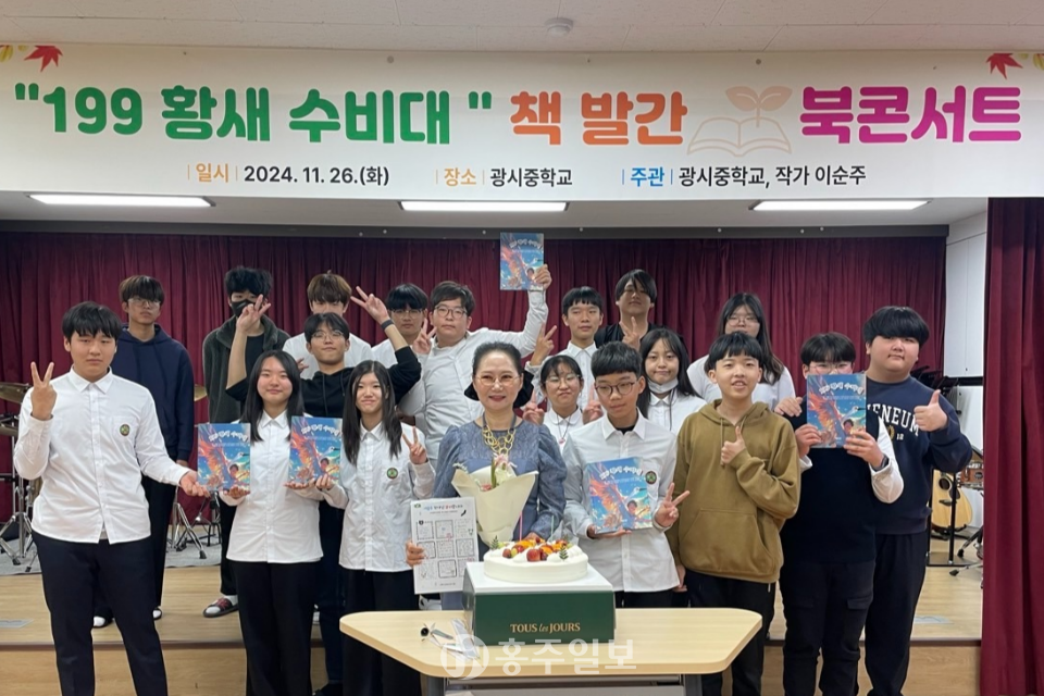 예산 광시중학교(교장 신대섭)는 지난 25일 ‘199 황새 수비대’ 동화책 발간을 기념하는 북콘서트가 열렸다고 밝혔다. <사진>