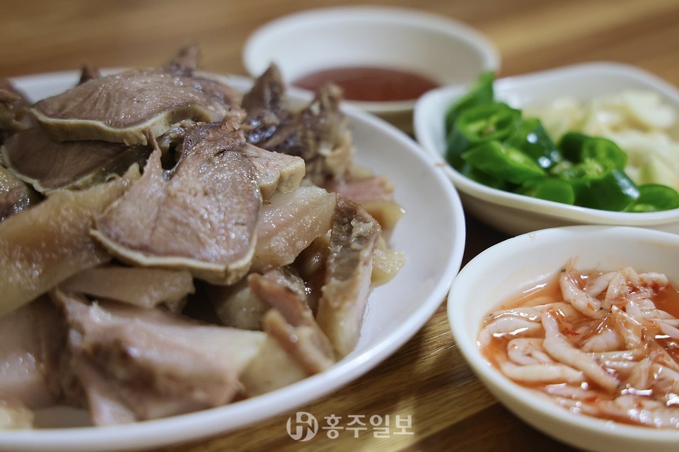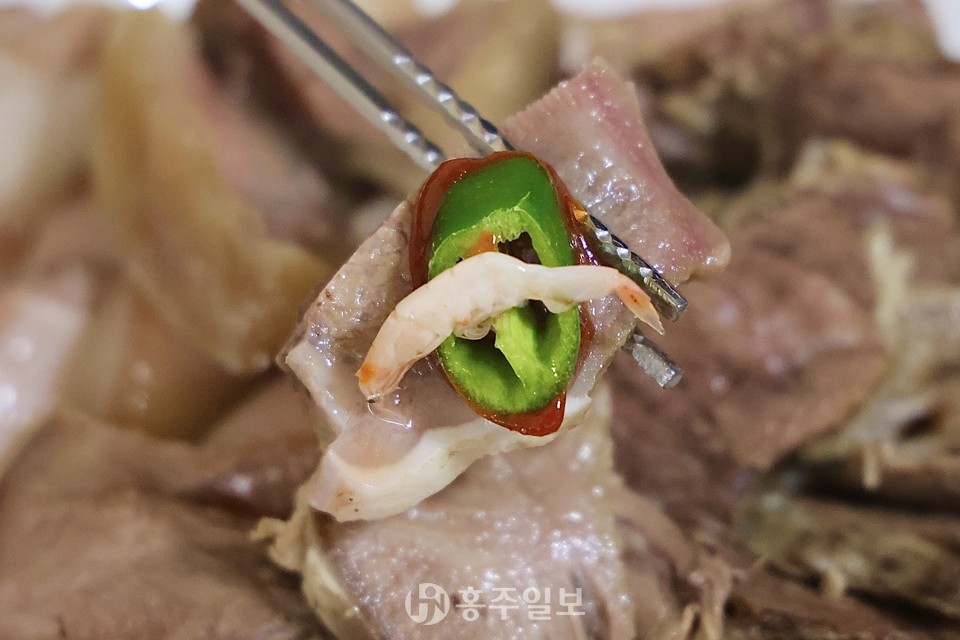 식탁에 먼저 놓이는 건 머리 고기다. 새우젓, 풋고추와 생마늘, 고추장이 함께 따라와 머리 고기를 뒷받침한다. 어느 하나도 허투루 놓인 것이 없다. 미각·시각·과학적으로 모두 충족되는, 최상의 궁합만이 놓여있다. 혓바닥과 입천장 사이에 놓인 고깃살은 삽시간에 결대로 흩어져 본래의 형태를 잃고 만다. 조직감이 원체 부드러워 치아가 시원찮은 어르신들이 잡숫기에도 불편하지 않을 정도다. 촉촉한 살코기와 고소하고 찰진 비곗살은 잡내 하나 없이 은은한 육향을 전달한다. 거기에 새우젓 중의 최고로 치는 육젓이 더해지니 그야말로 군더더기 없는 맛이라 할 수 있다.