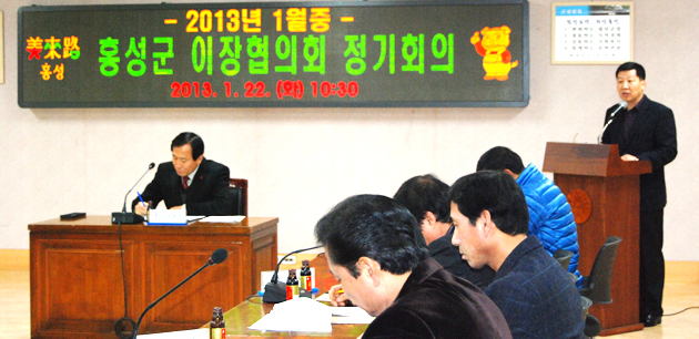 홍성군은 지난 22일 군청회의실에서 박복만 홍성군이장협의회장을 비롯한 읍·면 이장협의회장 및 총무 등 20여명이 참석한 가운데 정기총회를 개최했다. 이번 총회에서는 2012 결산감사와 함께 군정 시책 추진에 따른 협조사항과 지역 현안 등 홍성 발전을 위한 다양한 안건을 논의했다.