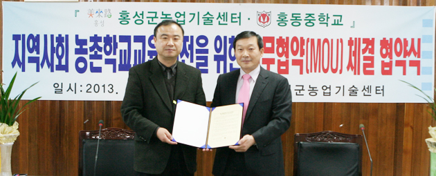 홍성군농업기술센터(소장 윤길선·사진 오른쪽)와 홍동중학교(교장 오능근·사진 왼쪽)는 지난 23일 홍성군농업기술센터 회의실에서 지역사회 농촌학교 교육 발전을 위한 상호 협력 협약을 체결했다. 이번 협약은 농촌에 살면서도 우리 농업과 농촌을 잘 모르고 자라나는 청소년을 대상으로 농업·농촌의 다원적 가치를 높이는 다양한 생태체험교육을 실시해 지역사회를 이해하고 생명산업인 농업을 통해 자라나는 청소년들의 인성을 함양하고자 체결됐다.