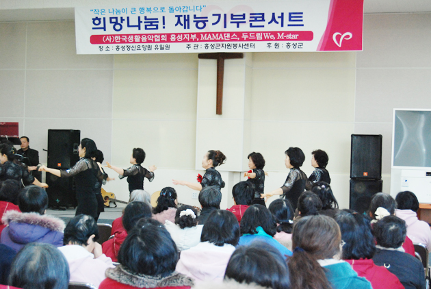 홍성군 '희망나눔 재능봉사단'의 문화·예술분야 단원들은 지난 26일 홍성정신요양원 유일원 강당에서 재능기부콘서트를 개최했다. 김덕자 (사)한국웃음센터 서해지부장의 사회로 진행된 이날 행사는 (사)한국생활음악협회 홍성지부에서 통기타, 색소폰, 아코디언 등의 연주를 선보였으며, MAMA댄스의 커플댄스, 두드림 WE의 난타공연, M-star봉사단의 방송댄스 등의 공연이 펼쳐졌다.
