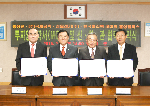 이날 군과 MOU를 체결한 (주)국제금속은 변압기 강관을 생산하는 기업으로 홍성일반산업단지에 입주 예정인 일진전기(주)의 관계사로, 약 65억원을 투자해 올 하반기까지 공장을 준공할 예정이며 30명의 종업원을 채용할 계획이다.