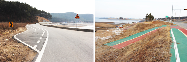 한편, 일명 임해관광도로에 조성된 자전거도로 역시 마무리공사가 매끄럽게 종료되지 못한채 방치되고 있어 일대의 미관을 훼손하는 한편, 자전거 이용자들의 안전도 위협받고 있다.<사진 오른쪽> 바닷가 바로 옆으로 조성된 자전거 도로 일부분이 해변 쪽으로 조성되는 과정에서 무슨 이유에서인지 중단된 채 방치되고 있다. 군 관계자는 기존 농수산과에서 시행한 기존 연안정비구간과 해안자전거도로를 연결하는 과정에서 자투리 공간이 남았다고 해명했다.