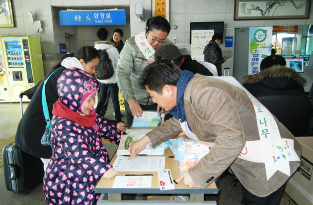 군 공무원과 그린스타트 홍성네트워크 및 충남그린스타트 네트워크 회원, 홍성생태학교 나무 회원 등이 참여한 가운데 지난 8일 오후 2시부터 6시까지 홍성역에서 귀성·귀향객들을 대상으로 녹색명절 만들기 캠페인을 전개했다.