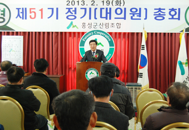 총회에 앞서 홍성군산림조합의 소득증대와 권익보호를 위해 헌신한 전병환 조합원과 홍성군청 유현모 지방녹지주사보에게 감사패를 수여했으며, 광천산악회 신영환 산악대장·장곡면 광성리 서철원 이장·김해경 임업후계자에게 홍문표 국회의원 표창을 각각 전달했다. 이어 진행된 총회에서는 지난 2012년도 중요사업 및 예산에 대한 결과 보고와 2013년도 주요사업계획 보고, 홍성군산림조합의 발전방향에 대해 논의하는 시간을 가졌다.