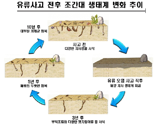 한편 환경부에 따르면 원유 유출사고 직후에는 두터운 기름이 해안가를 뒤덮어버려 생태계가 거의 궤멸상태에 이르게 된다. 3년이 지나서야 부착조류나 갯지렁이 등 기초대사를 진행하는 생물들이 서식하기 시작하고 조개 등 패류 생태계가 자리 잡기까지는 5년 이상이 걸린다.