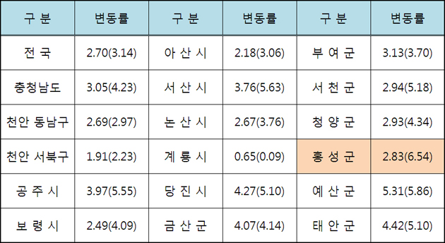읍면별로 살펴보면 결성면이 지난해에 비해 5.54% 상승하며 가장 크게 반등했고 홍동면 4.83%, 갈산면 4.76%, 구항면 3.91% 순이다. 용도지역별로는 녹지지역 4.21%, 관리지역 3.74%, 농림지역 3.27% 등의 순이다. 국토해양부 공시결과에 따르면 도내 개별공시지가 조사대상 330만 필지의 1.3%에 해당하는 4만1854필지를 표준지로 조사·평가한 결과 도내 땅값은 전년에 비해 3.05% 상승한 것으로 나타났다. 이는 내포신도시 이전과 서북부권 산업단지 조성 등 부동산실거래 가격상승이 주도했다. 다만, 계룡시는 토지거래량 감소로 하향안정 보합세를 유지했다. 홍성군의 경우 지난해에 비해 2.83% 상승하며 도 평균 변동률을 두 배 이상 웃돌았고, 내포신도시 조성으로 인한 지가상승이 주요 원인으로 손꼽혔다.
