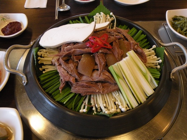 누룽지 오리 백숙은 유황을 먹여 기른 유황오리를 쓰고, 가장 맛있다는 21~23호의 오리 중 가장 큰 23호의 오리를 골라 황기, 오가피, 갈근, 구기자, 인삼 등의 각 종 약재를 넣어 만든다. 쪽득한 육질도 기가 막히고 잡내가 없어 먹기에 좋다. 좋은 재료들과 정성이 들어가는 만큼 준비시간도 1간여가량 걸려 미리 예약하지 않으면 성질급한 분들은 기다리느라 주린 배를 잡고 고생할 수도 있다.