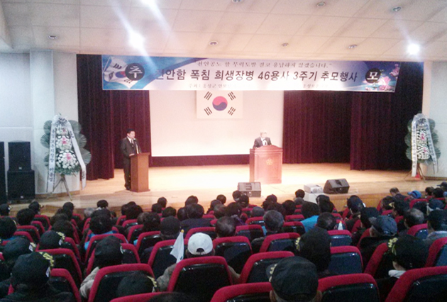 이날 천안함 용사 3주기 추모행사는 홍성군과 홍성보훈지청(지청장 이종경)이 후원한 가운데 국토방위 임무수행 중 고귀한 생명을 조국에 바친 천안함 46용사와 고(故) 한주호 준위의 희생정신을 기리고 이들에 대한 추모 분위기를 조성하고자 개최됐다.