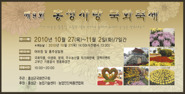 행사내용 : 국화작품, 야생화, 분재, 우수농산물 직거래판매, 깜짝이벤트, 고부간 가풍음식 명품