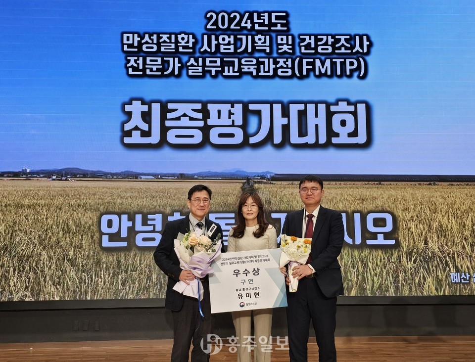 홍성군보건소 유미현 건강생활운영팀장이 지난 26일 개최된 ‘2024년 만성질환 사업기획 및 건강조사 FMTP 전국 최종 평가대회’ 구연부문에서 우수상을 수상했다.