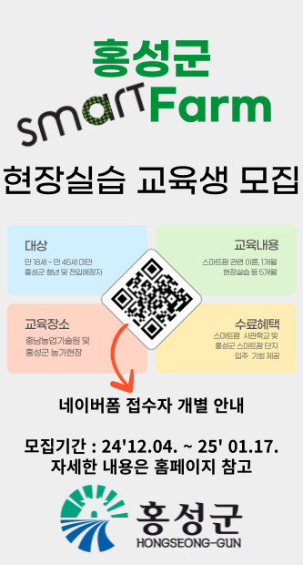 모집 기간은 오는 4일부터 내년 1월 17일 오후 6시까지이며, 홍성군농업기술센터 스마트농업팀을 △직접 방문 △전자우편(lisis@korea.kr) △QR코드(기사 하단)를 통해 접수할 수 있다. 자세한 모집 요강과 관련 정보는 홍성군농업기술센터 누리집에서 확인할 수 있다.