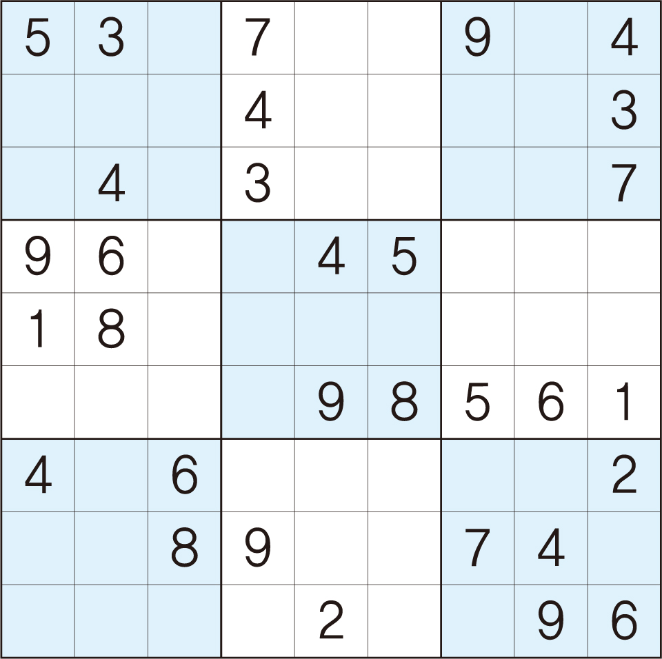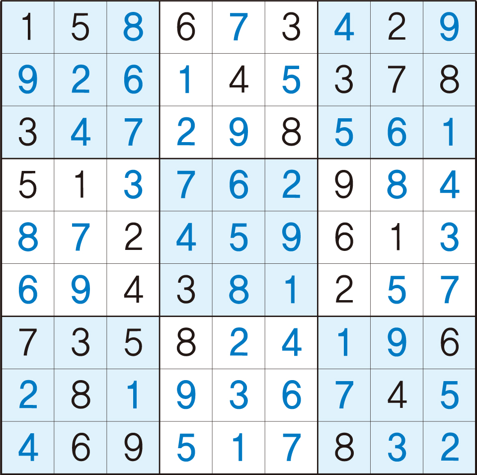 3. 큰 정사각형(9x9) 안에 있는 작은 정사각형(3x3) 안에는 숫자 1~9가 각 한 번씩 들어간다.