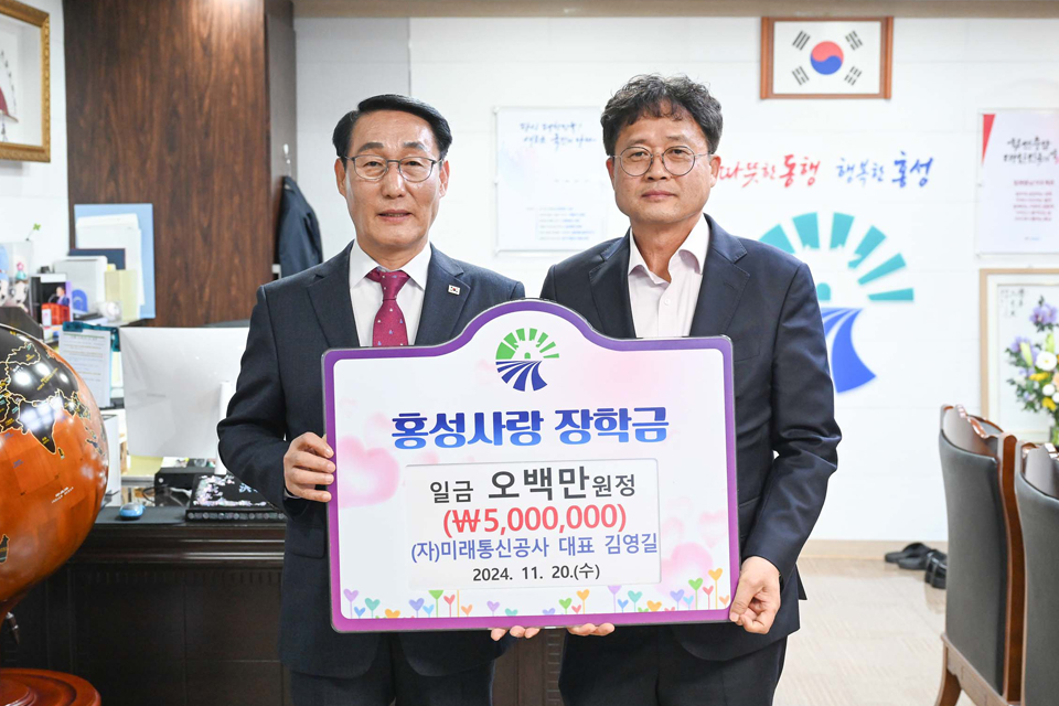 ㈖미래통신공사(대표이사 김영길)가 “홍성군의 미래를 이끌어갈 학생들이 꿈을 키워나가는 데 작은 보탬이 되길 바란다”며 홍성군 지역 인재 양성을 위해 지난 20일 홍성사랑장학금 500만 원을 기탁하며 지역사회 나눔을 실천했다.
