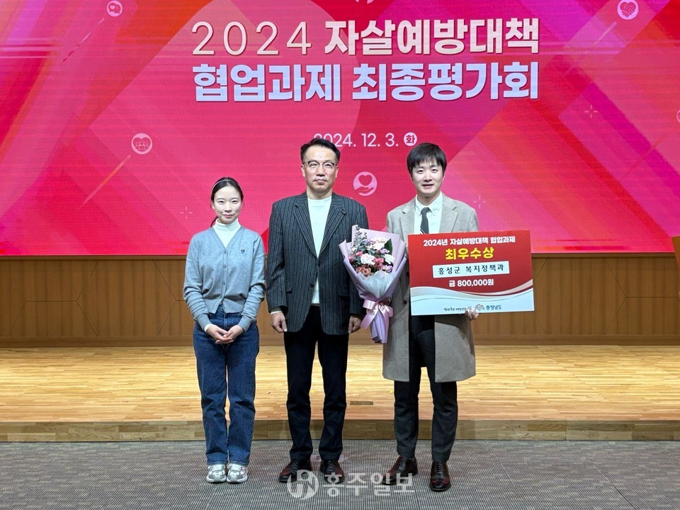 홍성군이 지난 3일 충청남도가 주관한 ‘2024년 자살 예방 협업과제’ 심사에서 고독사 고위험군 발굴과 예방 체계 마련으로 최우수상과 함께 포상금을 받았다고 밝혔다.<사진>