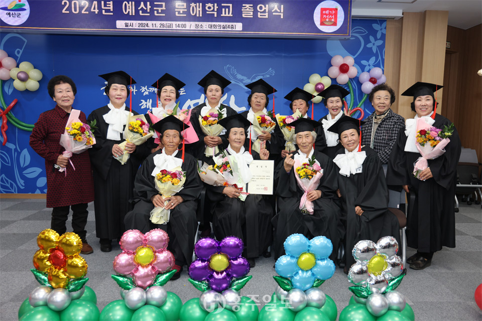 [홍주일보 예산=김영정 기자] 예산군은 지난달 29일 군청 대회의실에서 예산군 문해학교 졸업식을 개최했다. 이번 졸업식에는 38개 교실 433명의 어르신 가운데 삽교읍 상성2, 응봉면 장백, 봉산면 고도 등 3개 교실 36명의 어르신이 참석해 졸업의 기쁨을 누렸다.