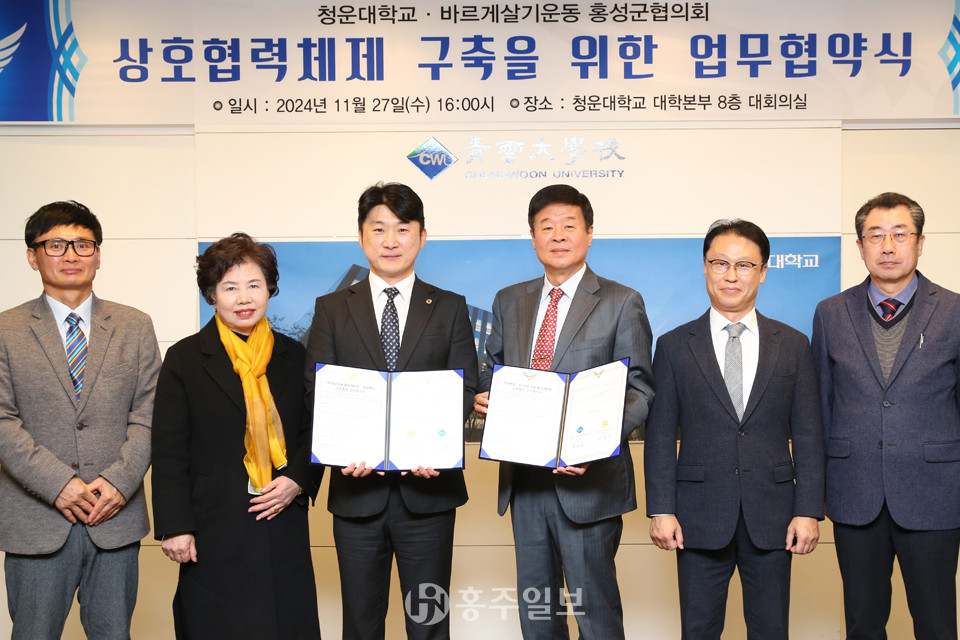 청운대학교(총장 정윤)과 바르게살기운동 홍성군협의회(회장 전헌수)는 지난달 27일 대학 본부 8층 대회의실에서 상생발전과 성인 학습자 평생 교육체제 활성화를 위한 상호 협력 업무협약을 체결했다.<사진>