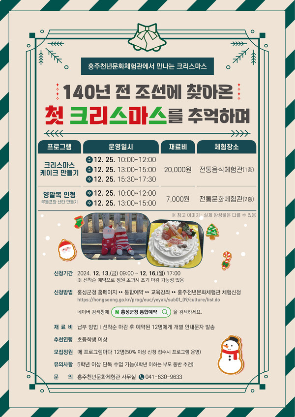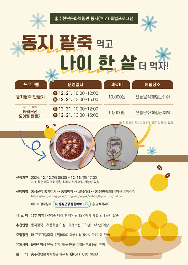 프로그램 신청은 홍성군청 홈페이지 통합예약란을 통해 진행되며, 동지 프로그램은 오는 12일부터 16일까지, 크리스마스 프로그램은 오는 13일부터 16일까지 선착순으로 접수한다. 체험비는 무료이나 프로그램 운영에 따른 재료비는 참가자가 부담해야 한다.