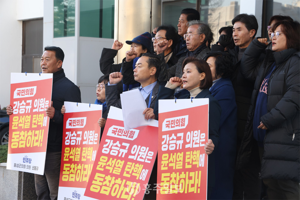 [홍주일보 홍성=오동연 기자] 더불어민주당 소속 홍성 군의원들이 윤석열 대통령 탄핵소추안 표결에 참여하지 않은 국민의힘 강승규 의원을 향해 “홍성군민에게 사죄하고 탄핵에 동참할 것”을 촉구했다.