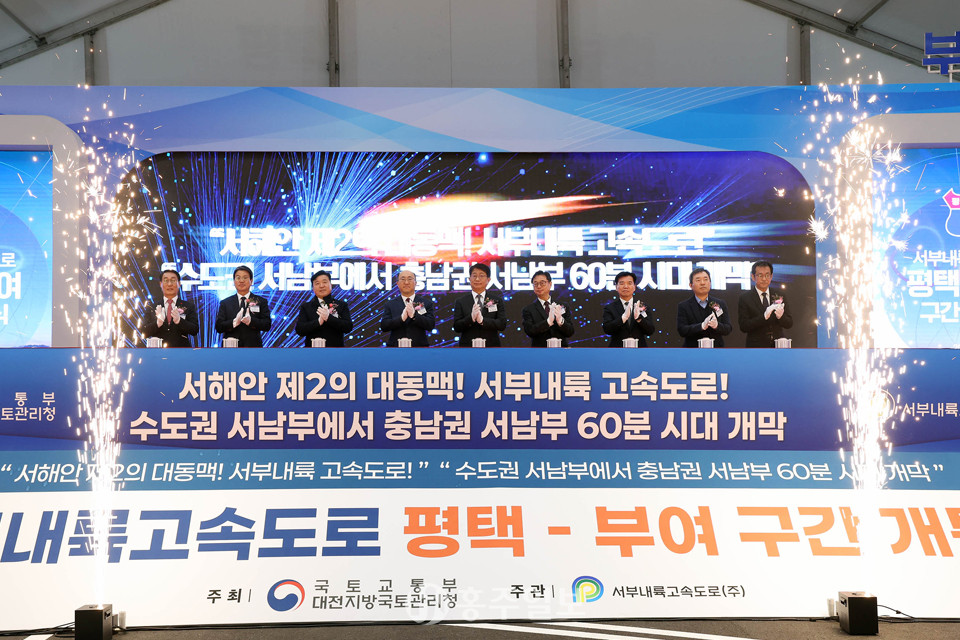 서해안 제2의 대동맥, ‘서부내륙고속도로 평택-부여 구간 개통식’이 지난 9일 예산 예당호 휴게소에서 박상우 국토교통부장관, 김기영 도 행정부지사, 이용록 홍성군수, 최재구 예산군수 등의 내빈과 지역주민 500여 명이 참석한 가운데 성대하게 개최됐다.<사진>